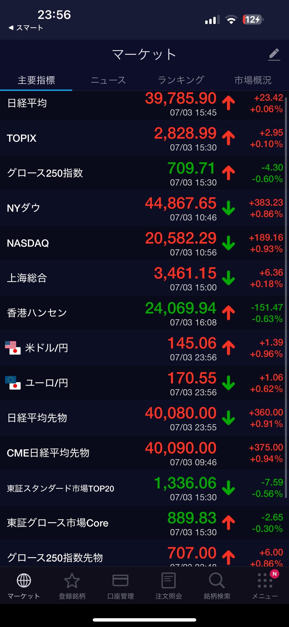 日経平均上げ、新興市場下げでした