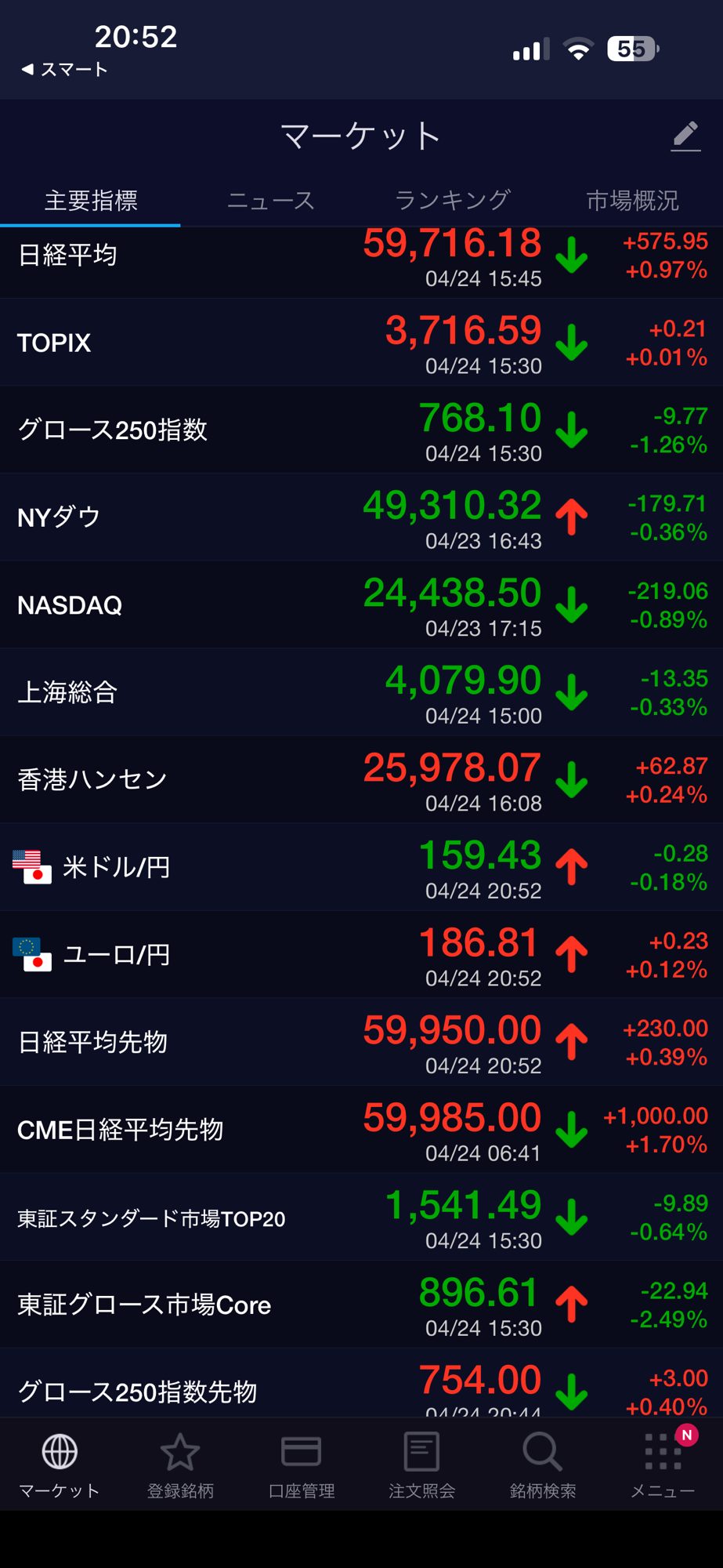 日経平均上げ、新興市場下げでした